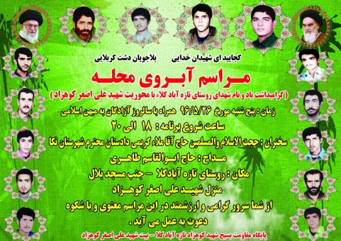 شایان ذکر است در بدو جلسه محمد مهدی اسبوچین مسئول پایگاه مقاومت شهید کوهزاد تاره آباد کلا ضمن خیر مقدم به شرکت کنندگان دررمراسم شهدا یاد آور شد:مراسم آبروی محله به یاد شهید کوهزاد تازآباد کلا با طراحی پایگاه مقاومت شهید کوهزاد و پایگاه مقاومت بسیج خواهران ام ایمن و بیت شهید و شورای اسلامی و دهیاری روستا در راستای برنامه های پاسداشت یاد و نام شهدا و تبیین فرهنگ ایثار در بین آحاد جامعه برگزار گردید.