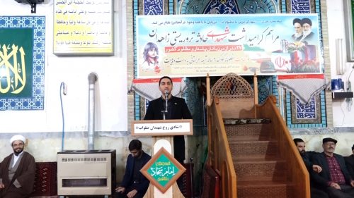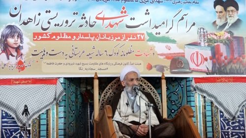 مراسم گرامیداشت شهدای جنایت تروریستی در جاده خاش _ زاهدان با حضور جمعی پیروان طریق ایثار و شهادت ، امام جمعه محترم شهرستان ، ریاست اداره تبلیغات اسلامی ، عضو شورای اسلامی ، پاسداران و ایثارگران شهرستان، پرسنل خدوم انتظامی ،جمعی ازخانواده های معظم شهدای ،روحانیت معظم و مردم انقلابی و فهیم منطقه در مسجد سجادیه این شهرستان برگزار شد .