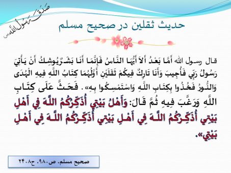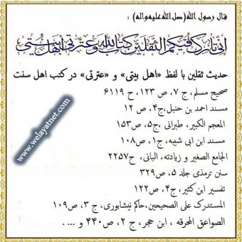 رسول اكرم صلّى اللّٰه عليه و اله فرمود همانا من دو چيز گرانبها در ميان شما مىگذارم كه اگر شما بر آن دو چنگ بزنيد هرگز بعد از من گمراه نخواهيد شد ، يكى كتاب خدا و ديگرى فرزندان منست اين دو از هم جدا نميشوند تا اينكه بر من وارد شوند در كنار حوض.