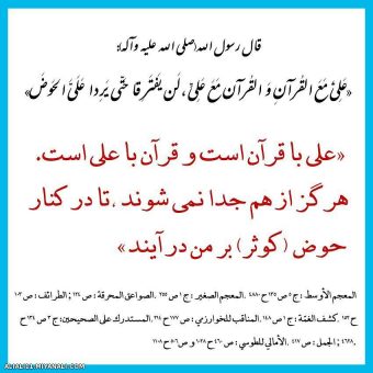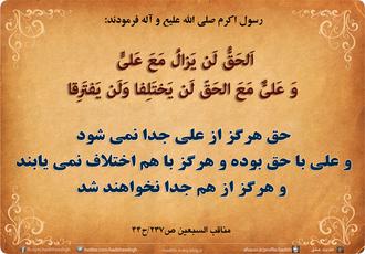 در روایت دیگر چنین آمده : «عليّ مع الحقّ و الحقّ مع علی یدور معه حیث دار» رسول گرامی اسلام در بیان دیگر علی را با قرآن و قرآن را با علی دانسته و می فرماید: «علي مع القرآن و القرآن مع علي لا يفترقان حتى يردا علي الحوض».
