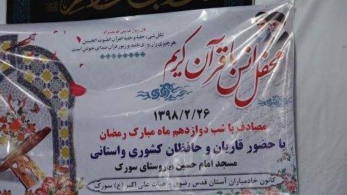 در شب دوازدهم از ماه مبارک رمضان محفل نورانی قرآن کریم با حضور قاریان و حافظان کشوری و استانی در مسجد امام خمینی روستای سورک برگزار گردید .