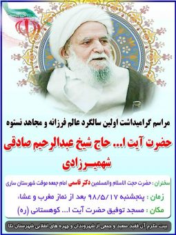 ویژه برنامه اولین سالگرد ارتحال حضرت آیت الله حاج شیخ عبدالرحیم صادقی شمیرزادی پدر سردار شهید محمد صادقی در غروب پنجشنبه ۱۷ مرداد همراه با اقامه نماز مغرب و عشاء در مسجد توفیق نکا برگزار می گردد.