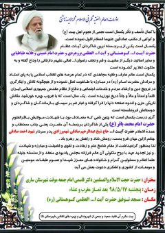 لذا به منظور گرامی داشت از مقام شامخ علم و ذهادت و تقوا و فضیلت و مبارزه و شهادت و نیز تجدید عهد با روح ملکوتی آن عالم فرزانه مجلس یادبودی منعقد و از سلسله جلیله علمای اعلام و مسئولین گرام و خانواده معزز شهدا و عموم طبقات مومنین و مومنات از کشوری و لشکری دعوت به عمل می آید