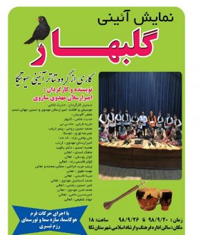 به گزارش نیکا خبر ، گلبهار به نویسندگی و کارگردانی امیر ارسلان مهدوی ساروی و همراه با اجرای موسیقی زنده حرکات فرم هوکا سما سازه سما و توری سما و رزم تبری همه روزه از ساعت ۱۸ تا تاریخ ۲۶ آذر ماه در سالن نمایش اداره فرهنگ و ارشاد اسلامی نکا به روی صحنه هست