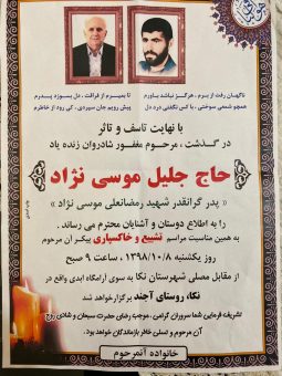 حاج جلیل موسی نژاد پدر بزرگوار شهید رمضان موسی نژاد روز گذشته آسمانی شد و به فرزند شهیدش پیوست .