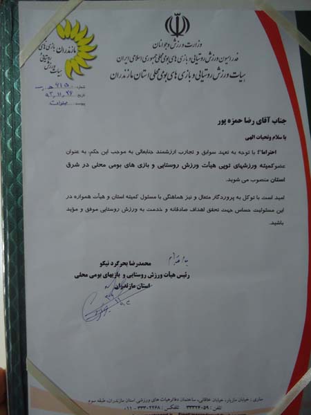 شایان ذکر است با توجه به خداحافظی رضاحمزه پور از فعالیت ورزشی در میاندرود رئیس هیئت ورزش روستایی و بازیهای بومی و محلی مازندران، در حکمی او را بهعنوان عضو کمیته ورزش های