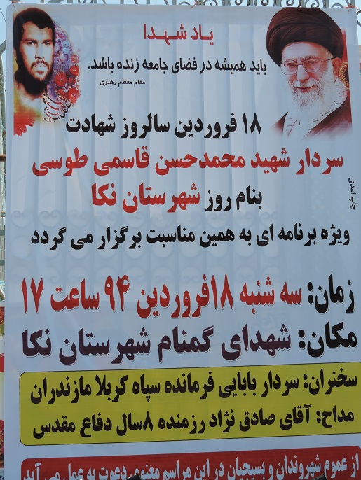 باسلام ضمن قدرداني از مجموعه زحمت كشان برنامه هاي مربوط به شهداي عزيزمان و در راس بچه هاي بسيج و سپاه.اين بس مايه مباهات و افتخار است كه روز شهرستان نكا در كشور سالروز شهادت سردار سرافراز طوسي نامگذاري شده است هرچند شهر پرآوازه ما به شهر روحانيت وآيات عظام وشهر شهدا وسرداران شهيد و همچنين نيروگاه نكا وبمباران شدن آن شهرت دارد حتما به دليل معرفي الگو هاي برتر مجاهدان و قهرمانان ملي به نسل هاي آينده و مخصوصا جوانان عزيز شهرمان اين روز تعيين شده است.واقعا دستمريزاد همه