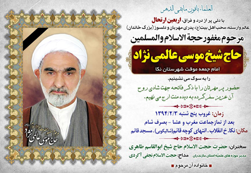 شايان ذكر است :حجت الاسلام موسی عالمی نژادامامت موقت جمعه در شامگاه ۲۲ اسفند ماه سال ۹۳ دعوت حق را لبیک گفت و به دیار باقی شتافت .