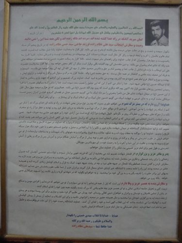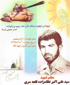 وصـيت وسفارش اينجانب سيد علي نظام زاده فرزند حاجي سـيد حسن نظام زاده كه در تاريخ پنجم آذريكهزارسيصدوشصت وپنج درحـالت حـواس درست بيان داشته ام بشرح زيرمي باشد.اول اقراربه وحدانيت خداوند يكتا جلّ جلاله كه قدرت كامله تمام عالم و عـالميان را آفريد وايجاد فرمودورزاق كل حال است حيات وممات كل موجودات در يدقدرت اوست وشريكي ندارد.ثانياً اقراربه يكصدوبيست وچهارهزارپيغمبران كه از جانب خداوند براي راهنماي بشر مبعوث شدند.ثالثاً اقراربه رسالت حضرت ختمي مرتبت محمدابن عبد الله صلي عليه واله كه خاتم تمام پيامبران مي باشد. و دين مقدسش الي يوم القيامه باقي برقرار است منكر آن كافر محض خواهد بود.رابعاً اقرار به ولايت حضرت علي ابن ابوطالب با يازده فرزندنش از جانب خدا و پيغمبر امام برحق ودادرس صحيح خلقان ازمهدالي الله لهدالي يوم الموعودمي باشند.اميدوارم به فرياداين ضعيف بنده عاصي وگناهكاردرهمه حال برسند.به حق محمد(ص)واله.خامثاً اقراربه مرگ وسؤال قبرواقراربه قيامت وترازوي ايمان وبهشت ودوزخ وانتظارفرج امام عصر(عج)فرجه الشريف بوده و مي باشم به اميد كمك خداوند بزرگ تصميم بر اين گرفتم كه جهت ياري رساندن به انصار آقا ابا عبدالله حسين (ع) راهي جبهه مي شوم.خدا راشكرمي كنم ازاين كه اين توفيق را نصيب بنده نموده است خدا را شكر كه سالهاي عمرم را تا فرا رسيدن اينچنين روزهاي مقدس قرار داد اكنون يوم الله ديگري است كه پيرو يوم الله حسين(ع) مي باشد . همان روزي كه درهزار و سيصد چهل سال قبل از اين حسين (ع) در ميدان شهادت نداي هل من ناصرا ينصرني را سر داد اينك ما مي گوييم حسين جان در فضاي گرم و خونين ايران زمين دست مردانگي مشت كرده و به نداي غريبي و تنهايت لبيك مي گويم حسين جان لبيك و اي پيشتاز و … و اي رهبر لبيك .(خداوندا آرزو دارم كه در بستر مرگ نميرم مي خواهم طوري بميرم كه بهترين نوع مردن يعني شهادت در راه تو باشد، اي خداي بزرگ تو را شكر مي كنم از اينكه رمز شهادت را به من آموختي .آموختم تا در مواقع خطر از مرگ نهراسم و عاشقانه به درياي خطر فرو روم و تهديد و خطر مر از راه تو منحرف نكند و از معركه هاي سهمگين وخطرناك روي بر نگردانم . قبول شهادت مرا آزاد كرده است من آزادي خودرابرهيچ چيز حتي به حيات خود نمي فروشم شهادت را انسان انتخاب مي كند مردني كه بر اساس انتخاب است نه مردني كه بر انسان تحمیل شود بلي گاهي انسان را مي ميرانند هر چند كه او نخواهد. و اين بنده حقير خود چگونه مردن را همانا شهادت در راه خدا مي باشد را انتخاب نمودم اميدوارم كه خداوند در صورت لايق و صلاحيت داشتن نصيبم كند).