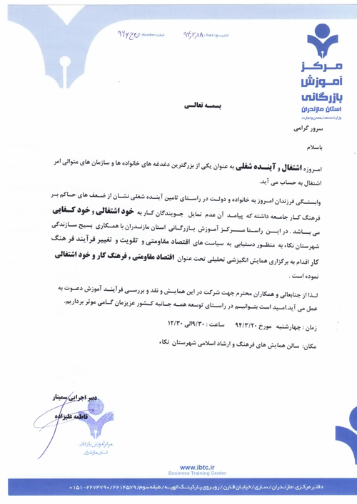 او گفت :در اين راستا مركز آموزش بازرگاني استان مازندران باهمكاري بسيج سازندگي شهرستان نكابه منظور دست يابي به سياست هاي اقتصاد مقاومتي و تغير فرآيند فرهنگ كار اقدام به برگزاري همايش انگيزشي تحليلي تحت عنوان اقتصاد مقاومتي ،فرهنگ كار و خود اشتغالي نموده است