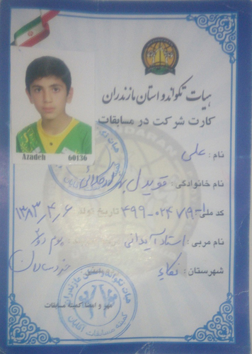 علی قویدل بهزادکلایی فرزند کاظمعلی ۱۱ ساله کلاس پنجم ابتدایی ساکن روستای بهزادکلا شهرستان نکا، او فعالیت ورزشی خود را از سال ۱۳۸۸ باعضویت در باشگاه آیدانی زیر نظر استاد حجت اله آیدانی آغاز کرد .