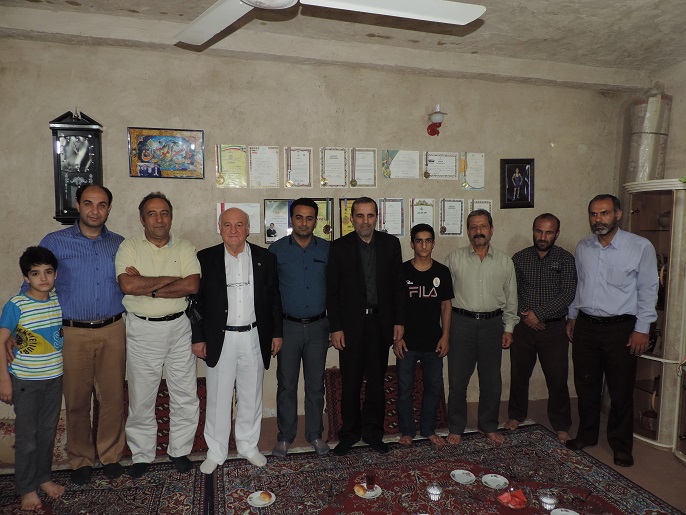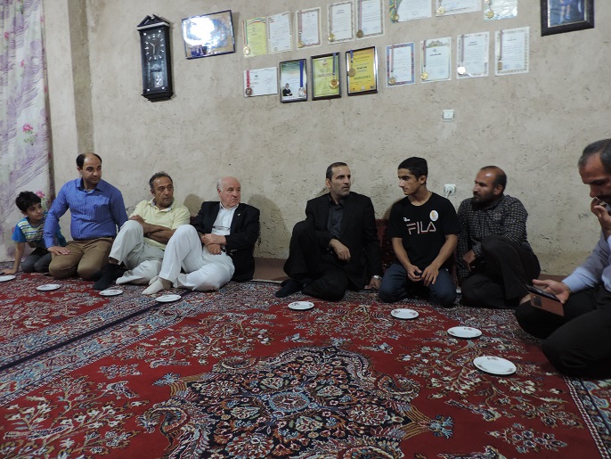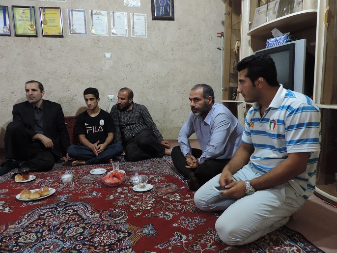 مسلما اين روزها و شب ها گروههاي مختلفي از مردم و شخصيت هاي استاني و شهرستاني براي عرض تبريك و تشويق او مي آمدند . ورود ما تقارن پيدا كرد با حضور يوسف نژاد نماينده اسبق مردم منطقه در مجلس شوراي اسلامي بهمراه حاج آقا نادري مدير هتل اسرم و تني چند از اعضاي شوراي اسلامي لاليم و نيز رضا حمزه پور كه به نمايندگي از طرف رضا بحرگرد نيكو رئيس انجمن كشتي لوچوي كشور حامل پيام تبريك او در اين جلسه حضور داشتند .