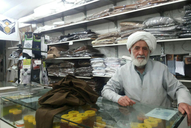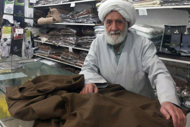 پیرمردی ۷۶ ساله که با لباس طلبگی بر روی صندلی چوبی مغازهاش نشسته و با افتخار از ۵۶ سال فعالیت خود در دوخت و دوز عبای طلاب سخن میگوید.