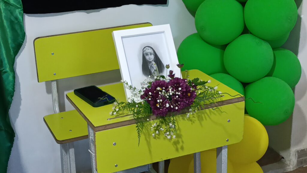 صندلیای که شاگردانش با شاخههای گل و ادای احترام، به یاد همسنوسالان شهیدشان تقدیم کردند.