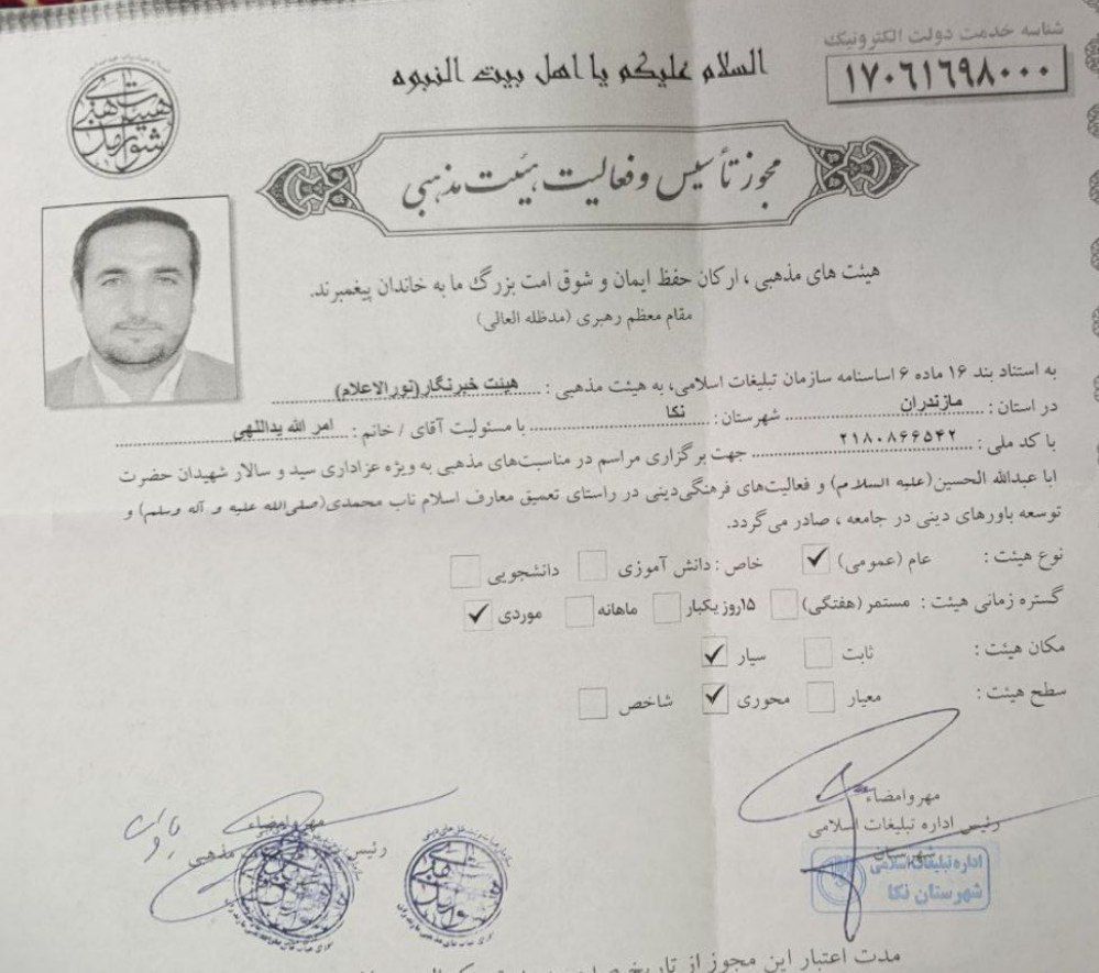 امرالله یداللهی مسئول هیات خبرنگار(نور الاعلام) گفت تمامی فعالیت های این هیات زیر نظر شورای هیات مذهبی استان مازندران با مجوز شماره ۲۲۱۱۳۰۰۱۳ سازمان تبلیغات اسلامی در گام نخست دربیش از ۴۵شهرستان نمایندگی خواهد داشت.